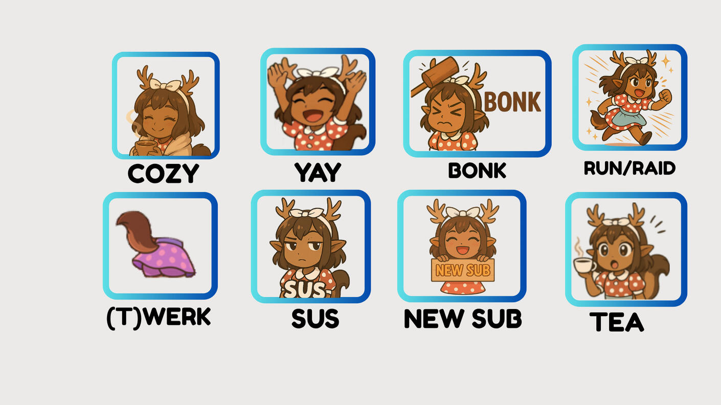 Custom Emotes by Mari | $3 EachEach emote is hand-drawn and designed to capture big energy in a tiny space—perfect for streamers, VTubers, and Discord servers looking to stand out.These examples feature a cozy deer-themed character with a full range of reactions: cozy vibes, hype moments, raid runs, sass, twerking chaos, and even hot tea. Whether you need a full set or a single mood, I’ve got you covered.